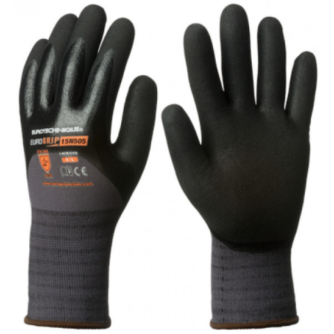 07. Mártott kesztyûkEUROGRIP 3/4 HÁT NITRIL MÁRTOTT+SANDY CSB RÉTEG_9EUROGRIP 15N505 3/4 NITRIL MÁRTOTT KESZTYÛ: ? szürke nylon-spandex alapanyagú kesztyû ? ökölcsontig fekete nitril mártás + a tenyerén fekete Sandy csúszásbiztos nitril réteg ? könny