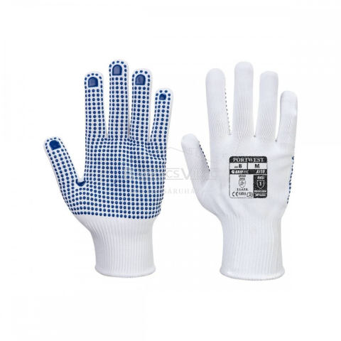Alapanyag: nylon, PVC. Száraz munkakörnyezetre javasolt, jó fogásbiztonságot adó modell. Egy darabban kötött, 13 gauge nylon, PVC pontozással.
