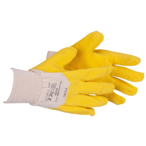 – pamut kesztyű rugalmas csuklópántokkal – félig mártot, sárga természetes latexben – a tenyér és az ujjak felületének csúszásmentes kezelése.