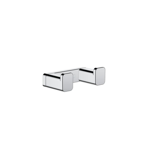 Két akasztós fogas króm színű. A Hansgrohe márkájú fürdőszobai kiegészítő szélessége 6,6 cm alapanyaga fém. Szerelési mód fúrással.