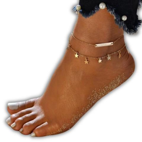 Kétsoros arany színű bokalánc állítható hosszal, csillag és fém lap medállal. Elegáns választás minden nő számára