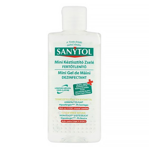 Kézfertőtlenítő gél SANYTOL mini kupakos 75ml Mini fertőtlenítő kéztisztító zselé természetes zöld tea kivonattal Lemosás nélkül, pH semleges, Aktív az A H1N1 vírussal szemben 99,9%*-ban elpusztítja: baktériumok, gombák, vírusok Hidratál és puhít