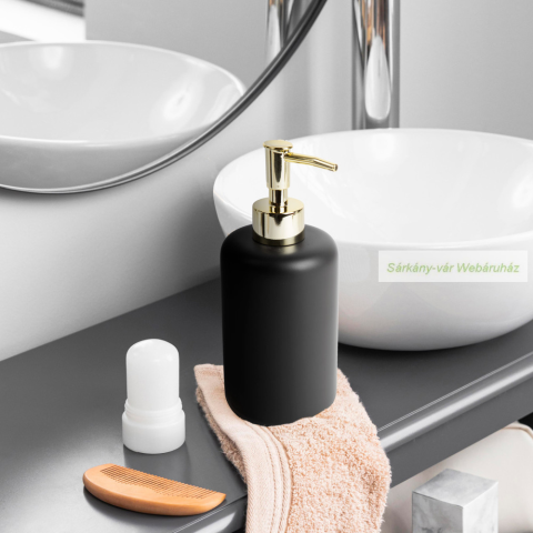 Ha fürdőszobájában vagy konyhájában eleganciára és funkcionalitásra törekszik, akkor ez a kézi pumpás szappanadagoló a tökéletes választás. A matt fekete színű alsó rész és az arany színű pumpa harmonikus kombinációja minden környezetben elegáns megjelené