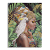 Kézzel festett falikép - Női portré papagájjal - 90x120 cm Ez a lenyűgöző kézzel festett falikép egy gyönyörű nőt ábrázol, egy fehér papagáj társaságában, trópusi környezetben. A vibráló színek és az elegáns textil applikációk egyedi eleganciát kölcsö...