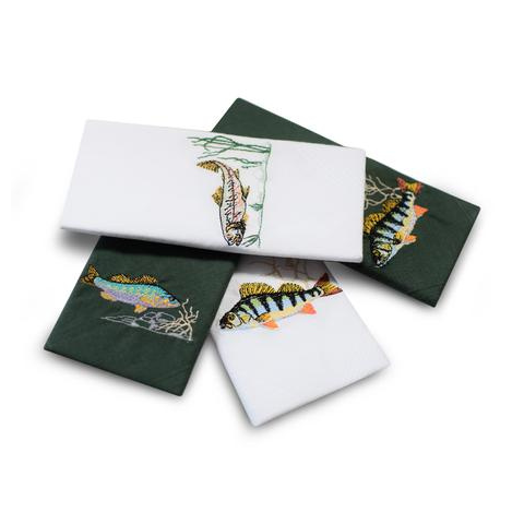Kiárusítás - horgász textilzsebkendő - vegyes Mennyiség: 1db Anyag: pamut Méret: kb. 38x38 cm Minta: hímzett hal minta (vegyes) Szín: fehér vagy sötétzöld alapszínen színes hímzett minta Csomagolás: csomagolás nélkül Bővebb termé