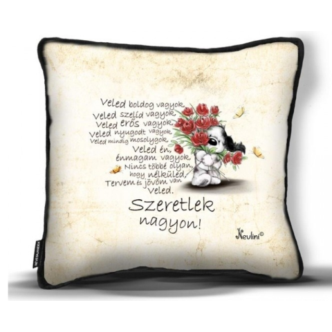 1 kép Kicsi díszpárna, Veled boldog vagyok, szeretlek, kutyus virágokkal