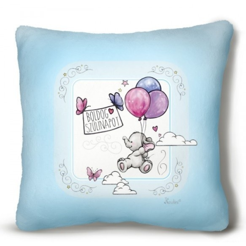1 kép Kicsi plüss díszpárna, Boldog szülinapot, kis elefánt lufikkal, kék