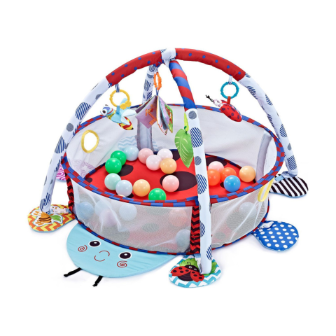 Kikkaboo játszószõnyeg 30 labdával katicás kék Interaktív játszószõnyeg 0-36 hónapos korig A baba hason fekve, hanyatt fekve, késõbb ülõ pozícióban használhatja -18 db színes labdával, - levehetõ felsõ ívekkel. - fejleszti a motoros készségeket - mind