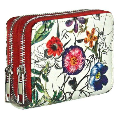 Fehér alapon mezei virágmintás piros dupla cipzáros kisebb műbőr pénztárca