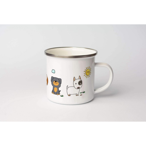 Zománcozott fém bögre kiskutyás mintával, amely felirattal névre szólóvá is tehető.A fém anyag miatt mikrohullámú sütőbe nem tehető be. Mosogatógépben tisztítható.