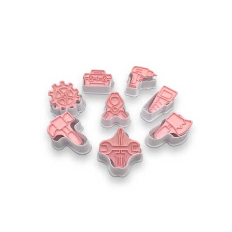 Kiszúró szett nyomdával, műanyag, szerszám, 8db Ez a nyolcdarabos kiszúró szett nyomdával olyan műanyag eszközök kínálatát tartalmazza, amelyekkel szerszám alakú süteményeket készíthet. A szettben található különböző formák, mint például csavarhúzó, ka