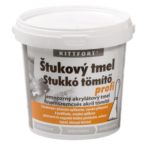 Kittfort stukkó tömítő 2 kg Speciális homokszemcsés tömítő vakolt felületek gyors és észrevehetetlen javítására. A tömítő pontszerű és felületi kül- és beltéri javításra használható. Alkalmazás: 1 mm-től 4 mm-ig. Kültérbe javasoljuk azonnal átfesteni. Csiszolást nem javaslunk csak átsimítjuk nedves szivaccsal. Színárnyalat: fehér - szürke. Felület: falazat, vakolat, gipszkarton, fa. Alkalmazás: spatulya, glettvas. Porszáraz 15 perc, csiszolható 45 perc