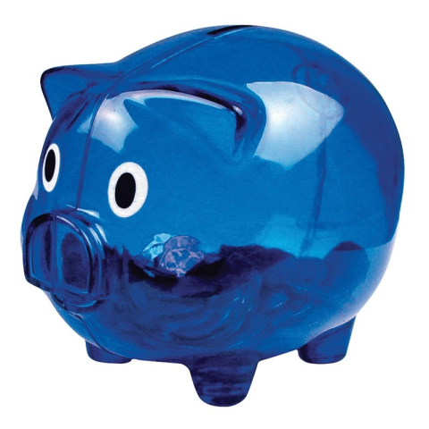 Klasszikus műanyag malacpersely, vidám áttetsző színekben, nem csak gyerekeknek. Méret 12,6 × 10 × 10,1 cm.