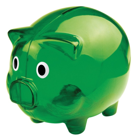 Klasszikus műanyag malacpersely, vidám áttetsző színekben, nem csak gyerekeknek. Méret 12,6 × 10 × 10,1 cm.