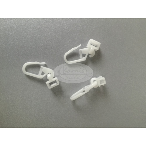 Fehér színű műanyag klikk csúszka (ráncszedő) kampóval 10 db/csomag Behúzó szalaggal varrt függönyhöz használható! Előnye, hogy a függönnyel együtt bárhol bele helyezhető (bele kattan) az alumínium sínbe, míg a nem klikk-es társai esetében a függönysín