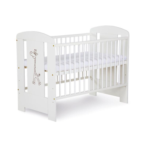 Stabil gyermekágy giraff applikációval, fenyőfából készült. Jellemzők: környezetbarát és biztonságos lakkozott, minőségi fenyőfa magasságban állítható alj – 3 pozícióban: kiemelhető rácsok lekerített, biztonságos ágyélek stabil szerkezet egyszerű ö