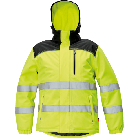 KNOXFIELD HV téli dzseki sárga 4XL • bélelt jólláthatósági férfi télikabát levehető kapucnival • meghosszabbított hát- és vállrésszel • cipzáras, kontrasztos színű mellzsebbel • 2 oldalzsebbel • és 2 zárható belső zsebbel • A kabát alja húzózs