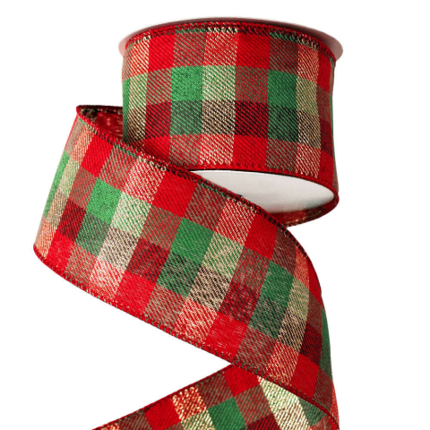 Kockás karácsonyi szalag drótos szegéllyel 63mm x 10m - Piros/Arany/Zöld