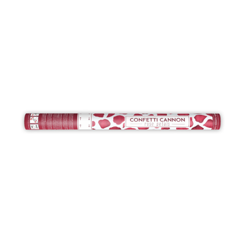 Mélyvörös mesterséges rózsaszirmokat lövöldöző konfettiágyú, hossza 60 centiméter.