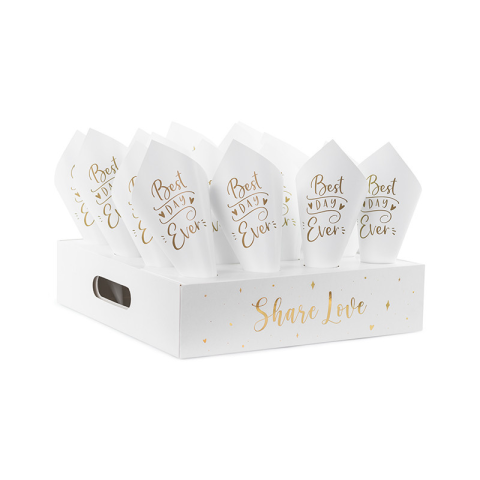 Konfetti kúpos állvány, színkeverék. A készlet 16 darab papírból készült konfetti kúpot tartalmaz, arany felirattal és állvánnyal az összeszereléshez.