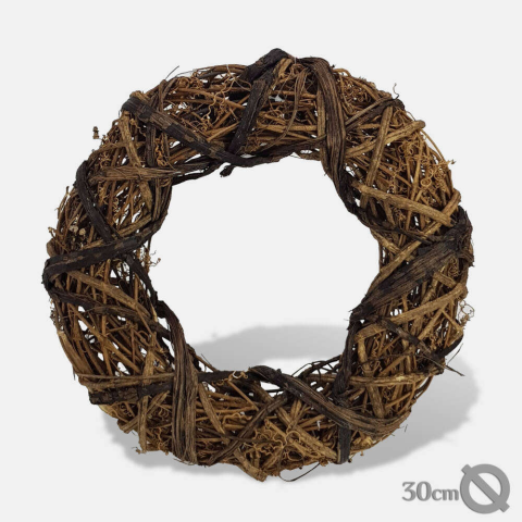 Fém váz alapú, masszív, barna indákkal körbetekert koszorú. Egzotikus és látványos koszorúalap, ami könnyedén díszíthető és beleillik a tavasztól őszig tartó összes szezonális dekorációba. Méret: átmérő: 30cm, vast.: kb.80mm