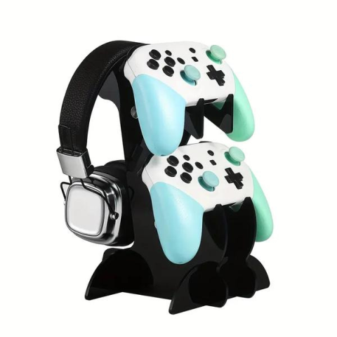 Kontroller és fejhallgató tartó állvány – 23 × 15 cm fekete CV2898990-2fEz a praktikus állvány ideális megoldás a játékosok számára, hogy rendezetten és biztonságosan tárolják kontrollereiket és fejhallgatóikat. Kialakításának köszönhetően egyszerre két darab játékvezérlőt és egy fejhallgatót tarthat, így mindig kéznél lesznek a kiegészítők.Az állvány stabil, tartós anyagból készült, és modern, letisztult dizájnjával illeszkedik bármelyik gamer