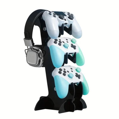 Kontroller és fejhallgató tartó állvány – 32,5 × 15 cm fekete CV2898990-3fEz a praktikus állvány ideális választás játékosok számára, akik szeretnék rendezetten és biztonságosan tárolni eszközeiket. A kialakítás lehetővé teszi, hogy egyszerre három darab kontrollert és egy fejhallgatót helyezz el rajta, így minden kéznél lesz a játékhoz.Stabil és tartós anyagból készült, modern és letisztult megjelenésével pedig bármely gamer sarok vagy íróasztal stí