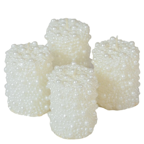 Kontúrozott gyöngyös metál henger gyertya 60x75mm fehér