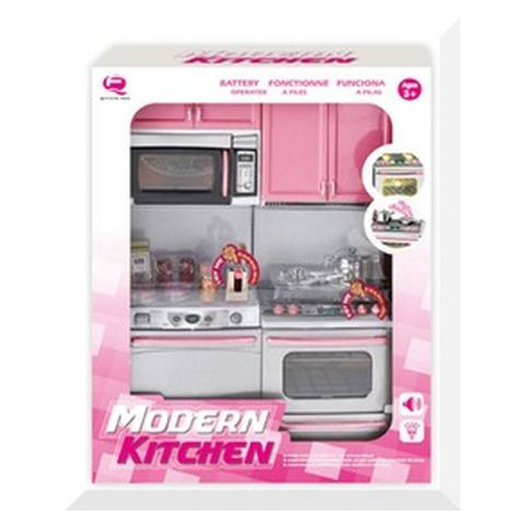 Konyhai eszközkészlet mosogatógéppel Főzz és süss finom ételeket a modern konyhában! A Konyhai eszközkészlet mosogatógéppel egy ezüst és rózsaszín alapszínű konyhabútor, sütővel, mosogatóval, kenyérpirítóval és mikrohullámú sütővel A Konyhai eszközkés