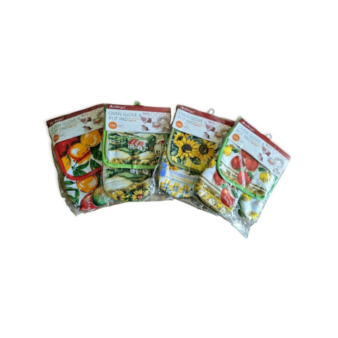 A konyhai kesztyű és tepsi fogó szett ami egy dekoratív díszítéssel ellátott, vastag konyhai kesztyűt és egy hasonló mintával ellátott edényfogót tartalmaz. Praktikus kellékek a konyhában amikkel könnyen kezelhetjük az igazán forró edényeket, és tepsiket