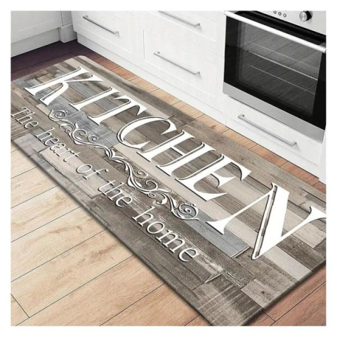 Konyhai szőnyeg 50 x 120 cm EJ106368Vintage fa hatású dizájnnal és felirattalTedd otthonosabbá és stílusosabbá a konyhádat ezzel a vintage hatású konyhai szőnyeggel, amely nemcsak dekoratív, hanem kényelmes és praktikus is. A "Kitchen – The heart of the home" felirat elegáns és barátságos hangulatot kölcsönöz a helyiségnek, miközben a fa hatású mintázat természetes megjelenést biztosít.Főbb jellemzők:Stílusos dizájn: Vintage fa hatású minta és elegáns bet