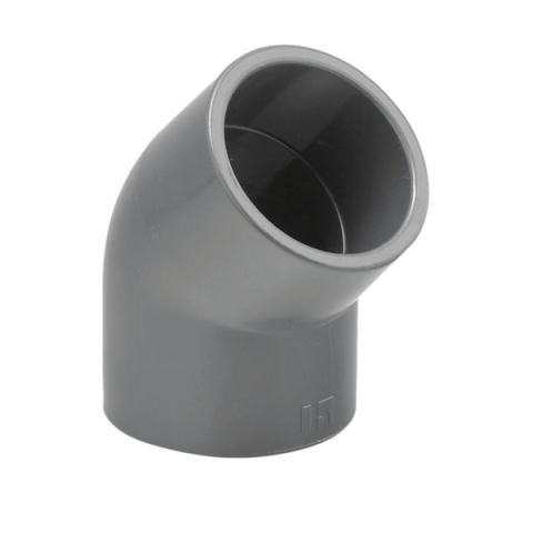 Könyök - 45º Kiváló minőségű, ragasztható, könnyű PVC-U könyök idom, belső menetes. Hosszú élettartam, kiemelkedő korrózióállóság és kopásállóság jellemzi. Felhasználhatósága egyszerű, összeszerelése praktikus és gyors. A PVC-U könyök egy csővezetéki