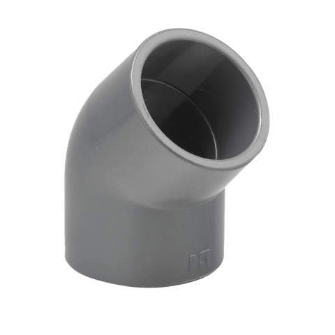 Könyök - 45º Kiváló minőségű, ragasztható, könnyű PVC-U könyök idom, belső menetes. Hosszú élettartam, kiemelkedő korrózióállóság és kopásállóság jellemzi. Felhasználhatósága egyszerű, összeszerelése praktikus és gyors. A PVC-U könyök egy csővezetéki