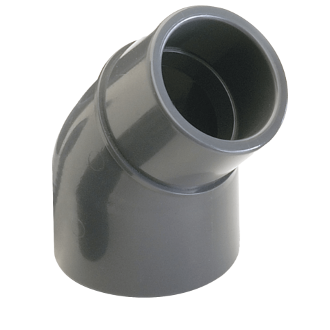 Könyök - 45º Kiváló minőségű, ragasztható, könnyű PVC-U könyök idom, belső menetes. Hosszú élettartam, kiemelkedő korrózióállóság és kopásállóság jellemzi. Felhasználhatósága egyszerű, összeszerelése praktikus és gyors. A PVC-U könyök egy csővezetéki