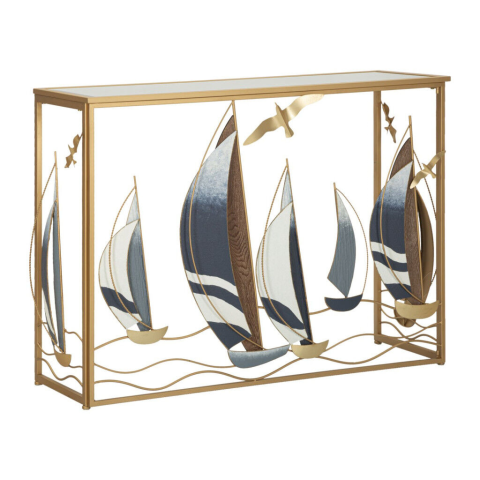 Tengeri stílusú konzol asztal hajó motívummal - Elegáns kiegészítő otthonába ⚓ Ez a gyönyörű konzol asztal arany fém szerkezettel és kék-fehér hajó motívummal tökéletes választás tengeri stílusú otthonokba vagy tengerre néző lakásokba. A bútor elegá...