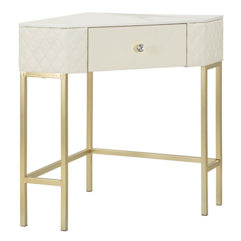 Sarokkonzol elegáns arany lábakkal és tárolóval ✨ Ez a gyönyörű sarokkonzol tökéletes választás, ha stílusos és praktikus megoldást keres a nappaliba vagy hálószobába. A steppelt bőr kárpitozás, az elegáns arany lábak és a beépített lábtartó páratla...
