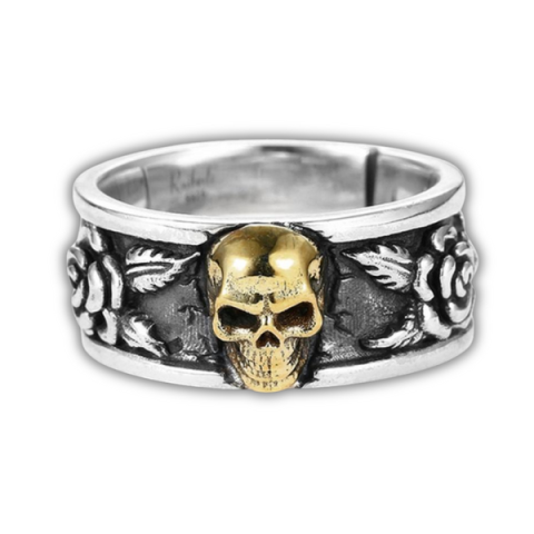 Ezüst-arany koponyás gyűrű rózsa motívummal, állítható méretben. Tökéletes punk gyűrű férfiaknak, egyedi megjelenésért