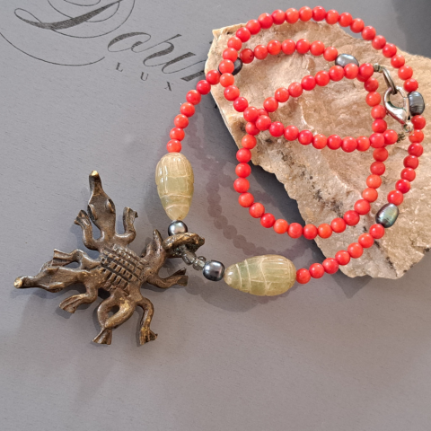 5 cm-es antik medállal , 2 cm-es kézzel faragott Smaragd kő. Korallal és igazgyönggyel kiegészítve . Egyedi, merész és nem készül több belőle. Az igazán különleges ékszerek kedvelőinek ajánlom. Szélesség: 0,5 cmHosszúság: 55 cm