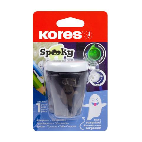 Hegyező, kétlyukú, tartályos, KORES Spooky Minőségi kétlyukú hegyező egyedi szellemes mintával -sötétben világító, elforgatható tetővel -normál és jumbo méretű ceruzákhoz is alkalmas -könnyű használatot biztosít az extra erős pengéknek köszönhetően
