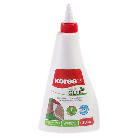 Hobbiragasztó, 250 ml, KORES White Glue -fehér PVA alapú hobbiragasztó -adagolós kupak -tiszta és könnyű használat -egyenetlen felületekre is alkalmas -ideális hobbi és kreatív tevékenységekhez -száradási idő: 2 perc -vízzel mosható -oldószermen