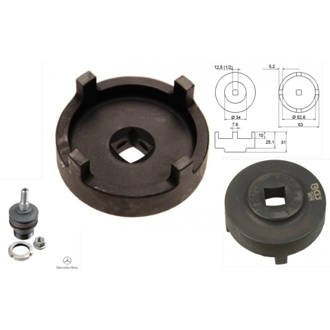 - a gömbcsukló rögzítőgyűrűjének eltávilításához alkalmas az első és a hátsó tengelyen - Mercedes-Benz W163 és W164 osztályú M-osztályon - lapos típusú - 63 mm külső átmérő, 1/2 hajtás. GH/5