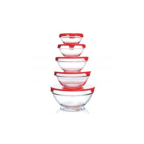 Üvegtál készlet mûanyag tetõvel 5 részes piros 10750000 - Sorolható üvegtál készlet mûanyag tetõvel - Otthoni, és éttermi használatra egyaránt ajánlott - Használható saláták, pudingok, krémek, desszertek tálalására - A készlet tartalmaz egy 9 cm, egy 10,5 cm, egy 12,5 cm, egy 14 cm és egy 17 cm átmérõjû tálat hozzájuk való fedõvel - Anyaga: üveg