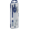 Fémből készült, hagyományos iskolai körző 4 kiegészítővel egy műanyag dobozban.