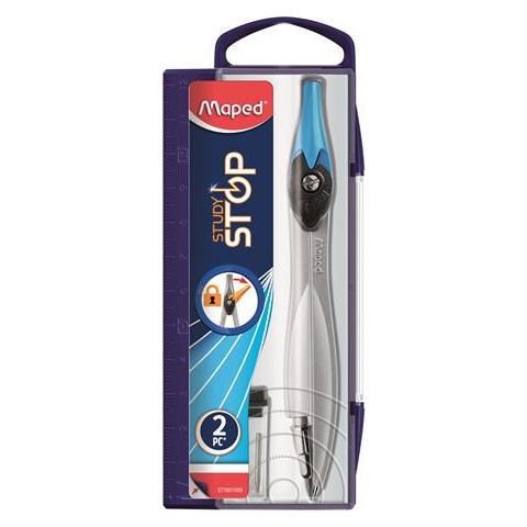 Körző készlet, rögzíthető lábakkal, 2 darabos, MAPED Study Stop - egyedülálló rögzítő rendszer: rögzíti a lábakat a precízebb használat érdekében - fém lábak - ergonomikus kialakítás - grafitheggyel - tartalék heggyel (külön tárolóban) - egyszerű ha