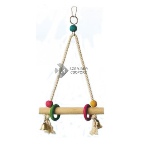 Madárhinta fa ülőrúddal, csengettyűkkel, kiegészítőkkel. Jól mutat a madárkalitkában. Kényelmes ülőhelyet biztosít a díszmadarak számára. A színes kiegészítők és a csengettyűk stimulálják a kisállatok érzékeit. Fém karabinere segítségével könnyen a kalitka tetejére akasztható.