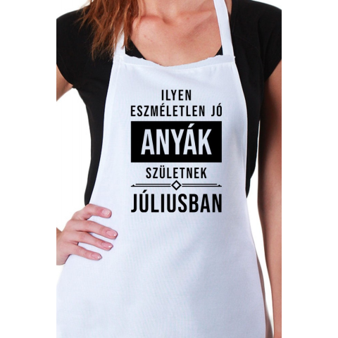 Kötény anyáknak, születésnapi ajándék édesanyáknak. Ilyen eszméletlen jó anyáknak születnek júliusban feliratos kötény. A rendelés során kiválaszthatod milyen hónap kerüljön a termékre. A kötény fehér vagy fekete színben választható, anyaga vászon, mérete