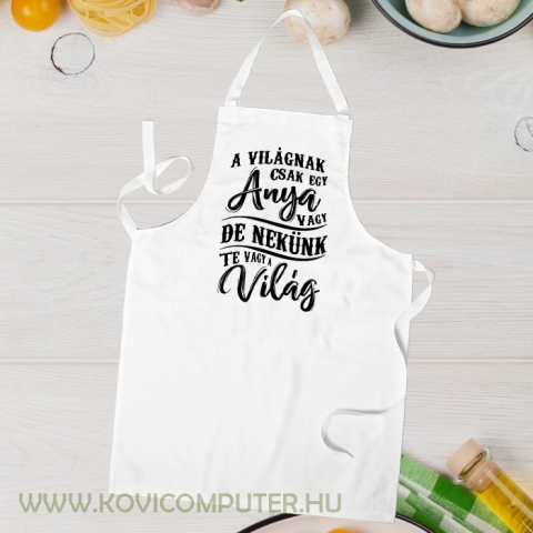 Kötény anyának, ajándék édesanyáknak. A világnak csak egy anya vagy, de nekünk Te vagy a világ felirattal. Népszerű ajándék anyák napjára, de bármilyen olyan alkalomra amikor anyukádat szeretnéd meglepni valami különleges ajándékkal. A kötény fekete színb