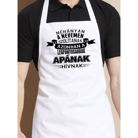 Kötény apáknak, legfontosabbak apának hívnak. Néhányan a nevemen szólítanak, azonban a legfontosabbak apának hívnak feliratos kötény. Fekete kötény választása esetén a minta fehér színnel kerül a termékre. Egyedi mintával ellátott kötényünk praktikus é