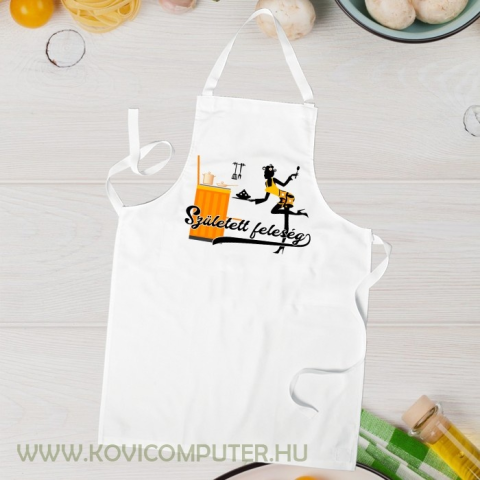 Született feleség kötény, ajándék nőknek. Született feleség feliratos kötény minden nőnek, lánynak aki szeret a konyhában sütni-főzni. Alapanyag: 100% poliészter (vászon) Méret: 66x78 cm (szél. x mag.) Egyedi mintával ellátott kötényünk praktikus és s