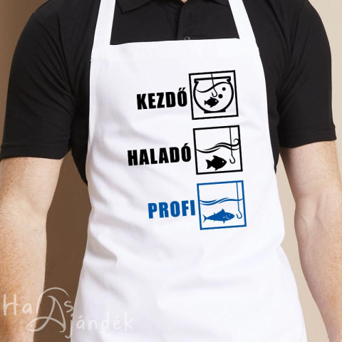 Vicces kötény horgásznak, Kezdő, haladó, profi feliratokkal, vicces mintával. Fehér és fekete színben rendelhető vicces ajándék pecásoknak. A kötény anyaga vászon, a minta tartós, többszöri mosás alkalmával is megtartja eredeti színét. Mosás: 40 °C-on ajá